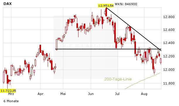 Aus charttechnischer Sicht bleibt die Situation beim DAX spannend. Der Seitwärtstrend zwischen der 200-Tage-Linie bei 11.956 Punkten und dem horizontalen Widerstand bei 12.320 Punkten ist nach wie vor intakt. Gültig bleibt auch der kurzfristige Abwärtstrend, der inzwischen bei 12.270 Zählern verläuft. Da neue Impulse nach oben derzeit fehlen, droht vorerst ein erneuter Test der unteren Begrenzung des Sietwärtskorridors.