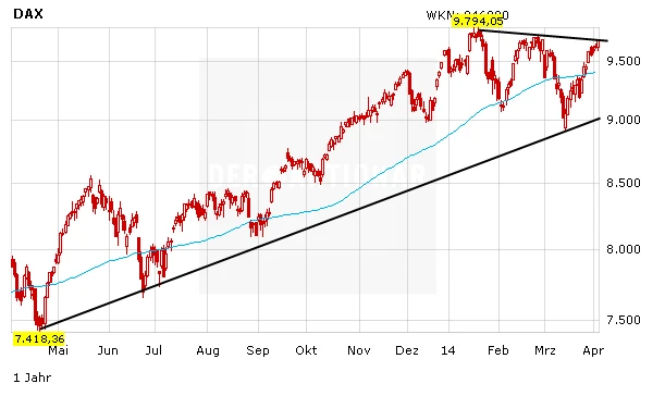Aus charttechnischer Sicht befindet sich der DAX seit dem Zwischentief im März im Zuge der Krim-Krise in einem kurzfristigen Aufwärtstrend. Momentan kämpft der Leitindex mit dem wichtigen Widerstand im Bereich um 9.660 Punkte. Gelingt es dem DAX, diese Hürde zu überwinden, wäre dies als weiteres Kaufsignal zu werten. Ein baldiger Angriff auf das bisherige Allzeithoch bei 9.794,05 Zählern wäre dann wahrscheinlich. Anleger können mit dem Turbo-Bull (WKN DZP 26T) von einem weiteren Kursanstieg profitieren. Ein Stopp sollte in einem Bereich knapp unter der 90 Tagelinie gesetzt werden, dass wäre bei 9.385 Punkten oder 10,80 Euro.