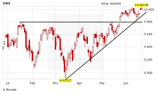 Der mittelfristige Aufwärtstrend beim deutschen Leitindex ist nach wie vor voll intakt. Anleger die in den empfohlenen Mini-Long mit der WKN DZP 8FV investiert sind bleiben dabei und lassen ihre Gewinne laufen. Derzeit besteht kein Handlungsbedarf. Ein weiteres positives Marktumfeld vorausgesetzt könnte der DAX in Richtung 10.500 Punkte klettern. Ein Stopp bei 9.770 Punkten oder 10,75 Euro sichert investierte Anleger ab.
