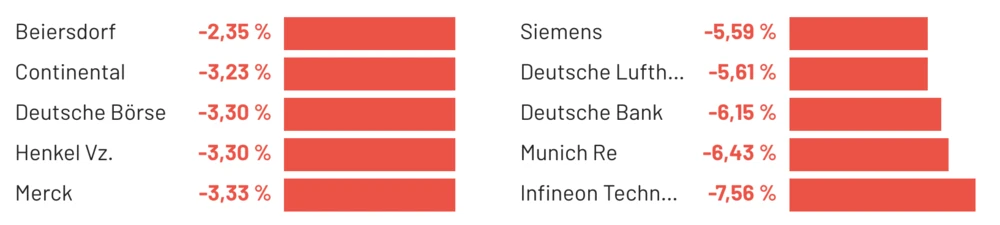 Ein Blick auf den Marktüberblick zeigt: Kein einziger Wert im DAX kann sich aus dem Sog lösen. Sämtliche Titel verlieren. Größte Verlierer sind die Aktien von Infineon, Munich Re (nach Zahlen), Deutsche Bank, Lufthansa sowie Siemens.
