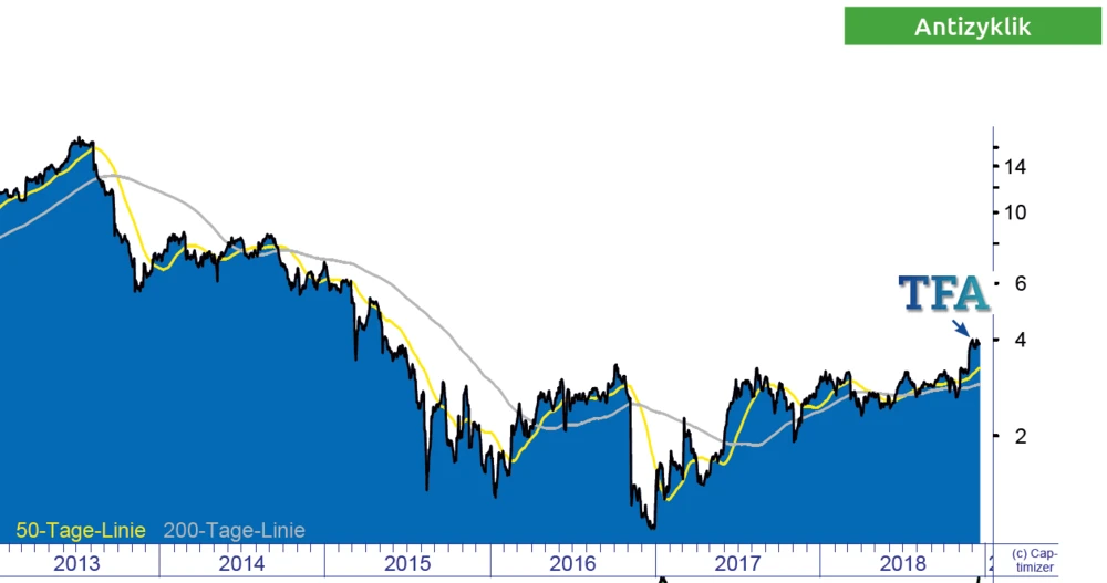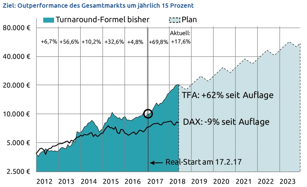 Jetzt mit dem TFA-Team durchstarten Die Turnaround-Formel gibt Ihnen jeden Monat die besten Anlagechancen für Aktien an die Hand, die noch nicht stark gestiegen sind – sondern erst beginnen, durchzustarten. Ein Musterdepot zeigt ganz konkret und transparent, wie Sie am besten investieren und Ihren Anlageerfolg optimieren. Es funktioniert: 15 Prozent Outperformance gegenüber dem DAX pro Jahr im Backtest seit 2000 und nun im Live-Einsatz 62 Prozent seit Februar 2017 (DAX: im gleichen Zeitraum Minus 9 Prozent)