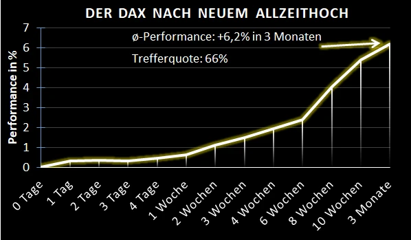 Kurzfristig kam es eher zu Anschlusskäufen als Gewinnmitnahmen. Die durchschnittliche 3-Monats-Performance von 6,2 Prozent entspricht dann annualisiert (auf ein Jahr hochgerechnet) sogar +27 Prozent. Immerhin elf Mal ging es im darauffolgenden Quartal auch bergab. Die Verluste hielten sich hier jedoch vergleichsweise in Grenzen.