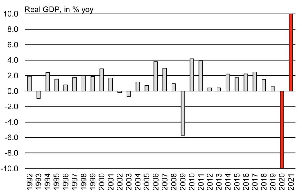 Mit Blick auf die Entwicklung in den Vereinigten Staaten von Amerika schreiben die Experten: "Die Wirtschaft wird in diesem Jahr wahrscheinlich um zehn bis elf Prozent schrumpfen, mit einer kumulierten Schrumpfung von 25 Prozent im ersten Halbjahr, da die Eindämmungsmaßnahmen in den kommenden Wochen verschärft werden. Der Arbeitsmarkt steht bereits unter großem Druck, und die Arbeitslosenquote wird wahrscheinlich von derzeit 3,5 Prozent auf über 10 Prozent steigen." Allein in den zurückliegenden Wochen haben sich zehn Millionen Amerikaner arbeitslos gemeldet. Die Erholung der US-Wirtschaft dürfte den Prognosen zufolge ebenso massiv sein wie der jetzige Absturz. UniCredit hält es für möglich, dass die US-Wirtschaft "bis Ende 2021 das Produktionsniveau von vor der Krise" erreicht.