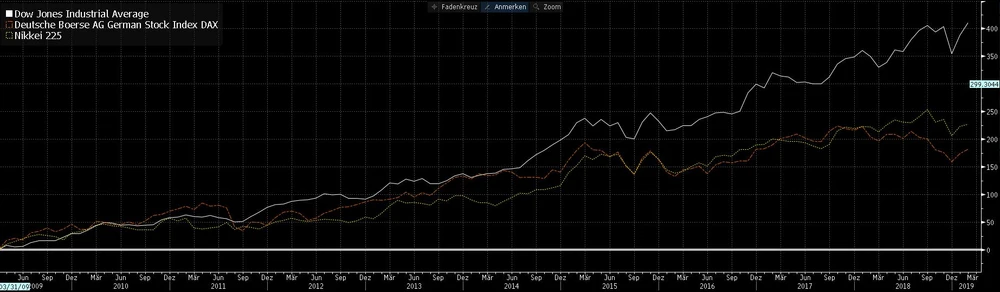 Hier ist die Übersicht der Entwicklung von Dow Jones, DAX und Nikkei von 2009-2019: