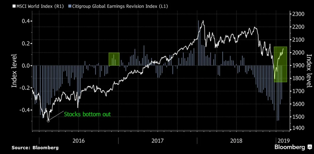 Im Frühling 2016 erreichten die Märkte in der Korrektur die Talsohle. Die Analysten blieben bearish – und die Gewinnschätzungen im Keller. Es dauerte zehn Monate, bis die Experten ihre Gewinnprognosen merklich erhöhten. Die Börse war allerdings schon zehn Monate lang gestiegen.
