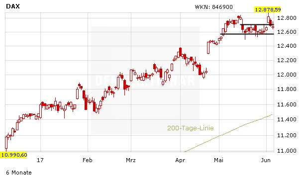 Wenn Comeys Aussage Trump nicht zu sehr belastet und die EZB ihre Geldpolitik vorerst fortsetzt, könnte der DAX neue Impulse bekommen. Ansonsten droht aber auch ein weiterer Rückfall bis in den Bereich von 12.500. Nur Mutige sollten im Vorfeld im Markt bleiben. Wer im Turbo-Long der DZ Bank mit der WKN DGV74F investiert ist, sollte einen Stopp bei 4,50 Euro setzen.