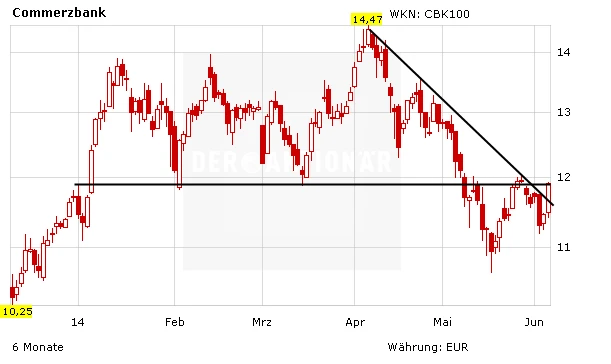 Durch das deutliche Kursplus hat der Banktitel den kurzfristigen Abwärtstrend vorerst überwunden. Die Aktie notiert damit bereits an der unteren Begrenzung des ehemaligen Seitwärtskorridors. Kann dieser Widerstand bei 11,80 Euro nachhaltig überwunden werden, wird die Commerzbank wieder interessant und könnte in Richtung der 14-Euro-Marke laufen.