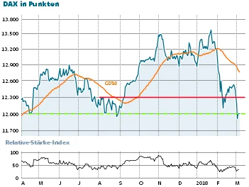 Mit dem Sprung über die Marke von 12.000 Punkten hat der DAX vorerst das Schlimmste verhindert. Zum einen liegt er damit über der horizontalen Unterstützung, zum anderen ist er in den seit dem Frühjahr 2016 gültigen Aufwärtstrend, der bei 11.980 Punkten verläuft, zurückgekehrt. Allerdings ist der Abstand zu diesen Unterstützungen relativ klein, sodass eine Entwarnung viel zu früh kommt.