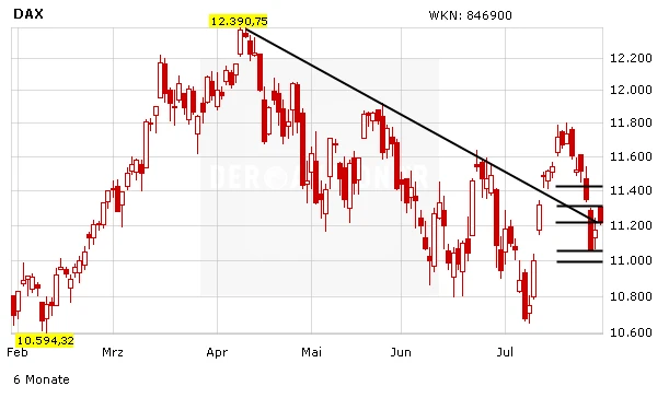 Die nächsten Ziele wären weiterhin die Kurslücke vom 24. Juli bei 11.339 Zählern, das 38,2%-Fibonacci-Retracement der erwähnten Abwärtsbewegung bei ebenfalls 11.339 Punkten und das 50%-Fibonacci-Retracement bei 11.428 Zählern. Als Unterstützungen dienen das Tief vom 27. Juli bei 11.052 Punkten, die Kurslücke bei 11.025 Zählern und die psychologisch wichtige, runde Marke bei 11.000 Punkten.