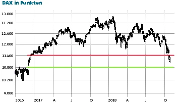 Vorbörslich wird der DAX immerhin noch im Bereich von 11.200 gesehen. Sollte er aber das Freitagstief unterschreiten, ist auch die 11.000-Punkte-Marke nicht mehr weit. Gibt es auch dort keinen Halt, rückt die Kurslücke von November 2016 in den Fokus. Deren untere Kante liegt bei 10.786 Punkten.
