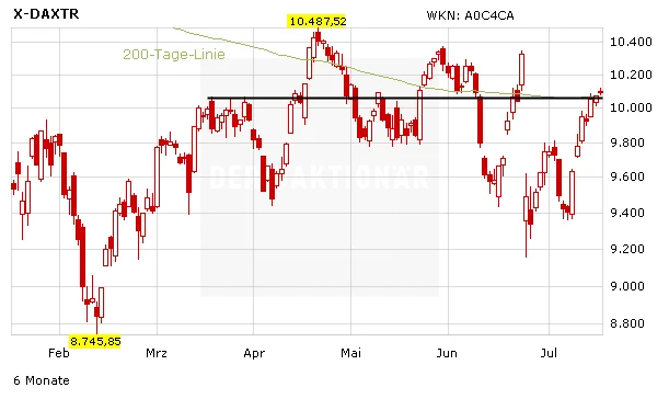 Dass der DAX die Ereignisse in der Türkei scheinbar mühelos wegsteckt ist bester Beleg dafür, dass der Markt nach oben will. Sollte die Berichtssaison einigermaßen zufriedenstellend verlaufen, ist für den DAX bis Ende des Sommers durchaus ein Anstieg bis 10.500 möglich. DER AKTIONÄR ist long im DAX-Turbo mit der WKN DG0KP5 seit 10,05 Euro.