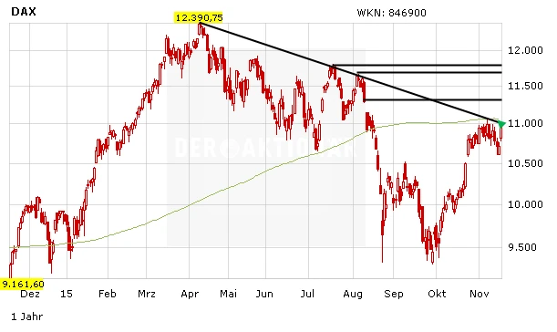 Was sagt die Charttechnik? Nach dem jüngsten Rücksetzer nimmt der DAX nun wieder Kurs auf die richtungsweisende 11.000-Punkte-Marke. In diesem Bereich verlaufen derzeit auch die wichtige 200-Tage-Linie und der mittelfristige Abwärtstrend. Wird diese Widerstandszone nachhaltig überwunden, warten bei 11.300, 11,600 und 11.800 Punkten die nächsten größeren Widerstände. Mehr zu diesem Thema sehen Sie im täglichen DAX-Check bei www.daf.fm oder lesen Sie an dieser Stelle.
