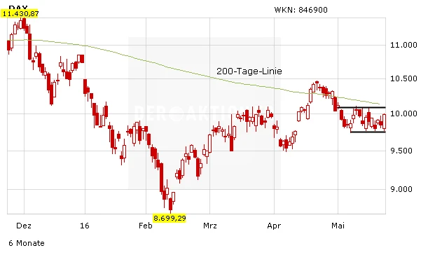 „Die seit etwa drei Wochen bestehende „Pattsituation“ zwischen Bullen und Bären sollte jedoch nur mit Hilfe eines neuen Richtungsimpulses aufgelöst werden“, heißt es in der charttechnischen Analyse der DZ Bank. „Wir können lediglich sagen, dass ein solcher auf der Zeitebene immer näher rückt, da sich die Kursausschläge im Zeitablauf sukzessive verringern.“ Das Fazit der Strategen fällt dagegen unverändert aus: „Steigt der DAX über die 200-Tage-Linie um 10.135 Punkten, ist mit einem Anstieg in Richtung 10.925 Punkte zu rechnen. Demgegenüber dürfte jedoch ein nachhaltiger Fall unter die 9.800 Punkte-Marke den Index recht schnell auf seine wichtige Unterstützung bei 9.500 Punkten absinken lassen.