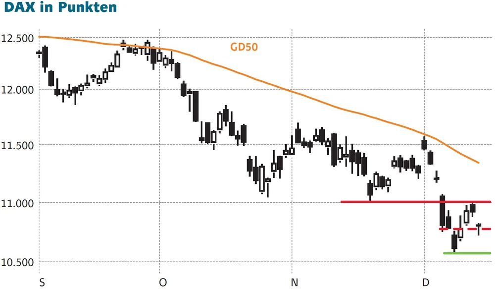 Technisch betrachtet ist der Umstand, dass sich die Marke von 11.000 Punkten erneut nicht überwinden hat lassen, negativ zu werten. Sollte auch der Unterstützungbereich 10.800 unterschritten werden, droht weiteres Ungemach. Dann kommt es letztendlich darauf an, dass das Jahrestief bei 10.585 verteidigt werden kann. Wenn nicht, dann "Gute Nacht!"