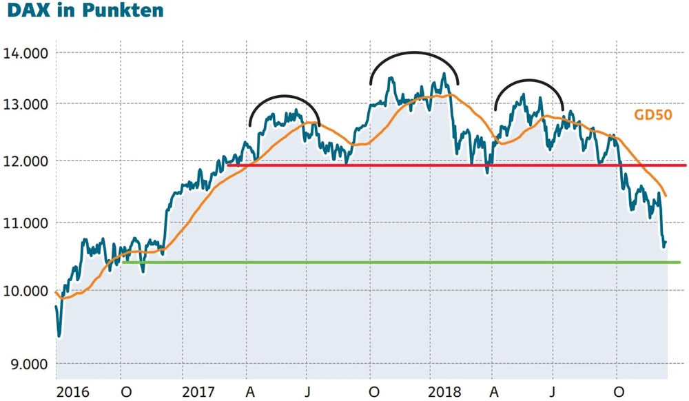 Aus Sicht der Charttechnik hat der DAX sein Abwärtspotenzial noch nicht ausgeschöpft. Theoretisch ergab sich aus dem Bruch der SKS-Nackenlinie Anfang Oktober ein Downside-Potenzial bis etwa 10.400 Punkte. Am Vortag fehlten nur noch 185 Zähler, nachdem er bei 10.585 ein neues Jahrestief ausgebildet hatte.