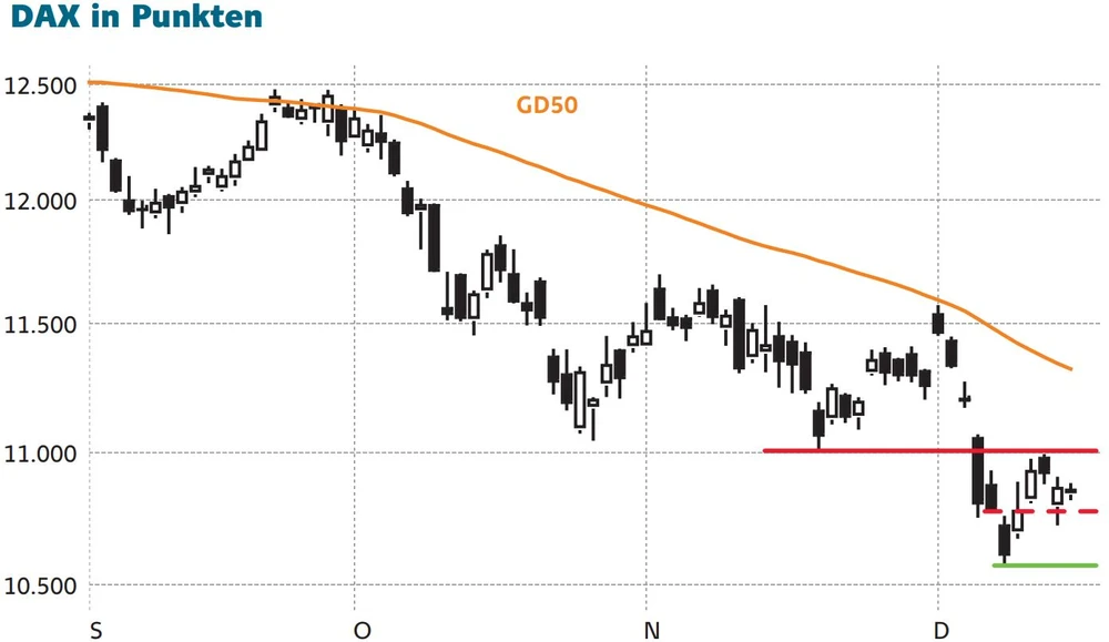 Aus technischer Sicht könnte man dem DAX die Absicht einer Bodenbildung unterstellen. Seit dem Verlaufstief bei 10.585 pendelt er volatil um die Marke von 10.800. Für die Bullen wäre ein Anstieg über 11.000 das züdende Signal, bei einem Rutsch unter das Tief vom Freitag (10.733) heißt es "Anschnallen!"