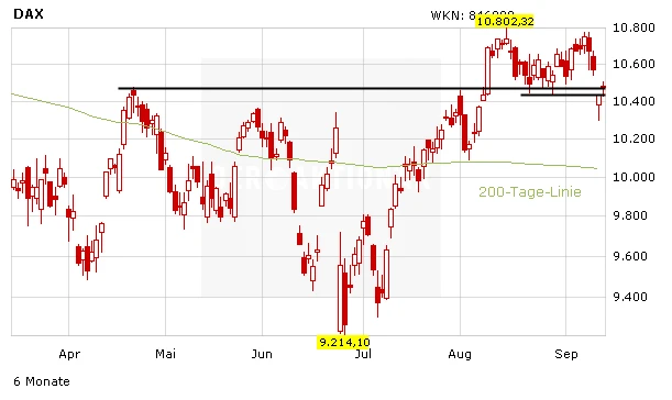 Technisch betrachtet ist der DAX aber noch nicht über dem Berg. Bis zu den Unterstützungslinien bei 10.474 (April-Hoch), 10.441 (Tief vom 29. August) und 10.400 Punkten (langfristiger Abwärtstrend) sind es nur wenige Zähler. Sollten diese Marken unterschritten werden, droht ein Rücksetzer bis zur 200-Tage-Linie, die momentan bei 10.044 Punkten verläuft. In diesem Fall wäre auch die Umkehrformation eines Doppeltops (10.800 Punkte) abgeschlossen.
