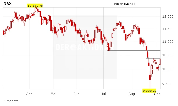 In den vergangenen Tagen war es für den DAX wegen der Turbulenzen an Chinas Börsen oft bergab gegangen. Am Donnerstag und Freitag bleiben diese aber geschlossen: Das Land feiert den 70. Jahrestag des Endes des Zweiten Weltkrieges in Asien. Für den deutschen Leitindex könnte sich dies positiv auswirken. Gelingt der Sprung über 10.400 Punkte, bietet sich ein Neueinstieg auf der Long-Seite wieder an. Die nächste horizontale Hürde wartet dann bei 10.650 Zählern.