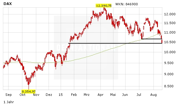Der DAX hat mit einem schwachen Start der US-Börsen seine Verluste am Donnerstag ausgeweitet. Die wichtige Unterstützung vom Juli bei 10.650 Punkten hat nicht gehalten. Die Kurslücke vom Januar wurde geschlossen.