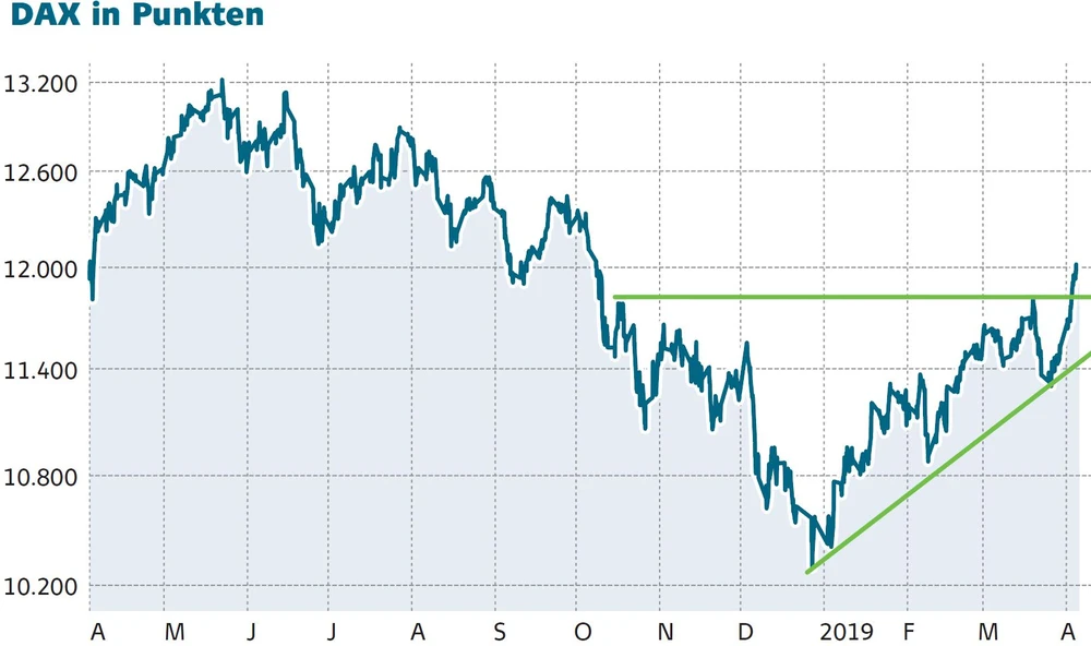 Aus Deutschland selbst kamen dagegen keine guten Daten. Der Auftragseingang der Industrie war im Februar mit einem Minus von 4,2 Prozent so stark gefallen wie seit Anfang 2017 nicht mehr. Die Angst vor einer Rezession nimmt damit wieder zu. Dass sich der Dax dennoch stabil halte, dürfte laut CMC-Markets-Analyst Jochen Stanzl daran liegen, „dass der Markt mit den gestrigen Kursgewinnen aus technischer Sicht ein klares Kaufsignal gesendet hat.“ Mit dem Sprung über 12.000 Punkte wurde auch das 50%-Fibonacci-Retracement bei 11.935 Zählern überwunden – ein klares Zeichen von Stärke.