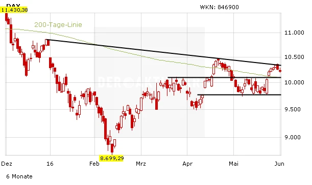 Entscheidend wird sein, ob die Unterstützung bei 10.100 Punkten halten wird. Hier verläuft nicht nur die 200-Tage-Linie, es liegen dort auch mehrere Hoch- und Tief-Punkte sowie ein Fibonacci-Retracement. Positiv wäre ein Überspringen des letzten Hochs, was im Anschluss einen Sprung bis 10.474 Zähler zur Folge haben dürfte.