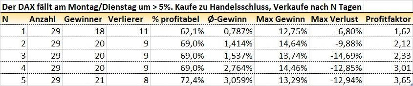 Der DAX hat allein in am Montag und Dienstag zusammengenommen 5,8 Prozent an Wert verloren. Vorbörslich wird er sogar noch niedriger indiziert. Einen ähnlich katastrophalen Start in eine Handelswoche gab es zuvor bislang nur 28 mal, zuletzt im November 2011! Wie es nach solchen Extremereignissen in der Vergangenheit typischerweise weiter ging, untersuchen wir hier.