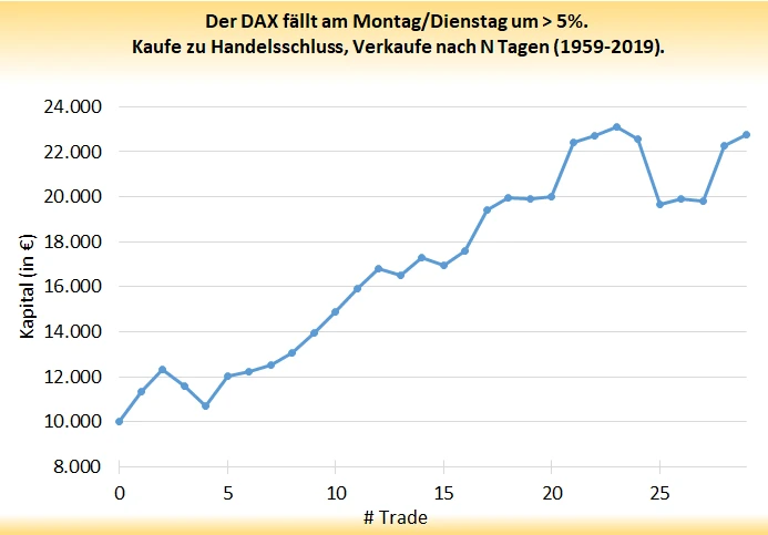 Die Auswertung zeigt eine klar bullishe Tendenz. In der darauffolgenden Handelswoche stieg der DAX im Durchschnitt um rund drei Prozent an – ein starker Vorteil für die Bullenseite. Aber die Schwankungen sind heftig. Am 2. August 2011 rauschte der DAX in den fünf nächsten Handelstagen beispielsweise um weitere 13(!) Prozent ab. Den statistischen Vorteil bezahlt man also damit, dass man das deutlich erhöhte Risiko eingeht. Die Kapitalkurve zeigt, was aus 100.000 Euro geworden wäre, wenn man in solchen Situationen auf einen Rebound gesetzt hat: