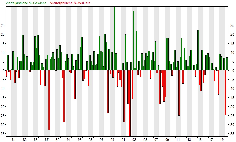 In der Grafik lässt sich deutlich erkennen, dass es im Laufe der letzten 40 Jahre mehrere Quartale gab, in denen der DAX deutlich über 20 beziehungsweise sogar über 25 Prozent eingebrochen ist. Zwar war die Geschwindigkeit des Absturzes nach dem eigentlich guten Jahresstart eine Besonderheit, aber das Ausmaß auf Quartalsebene im langen Zeithorizont keine vollkommene Seltenheit.