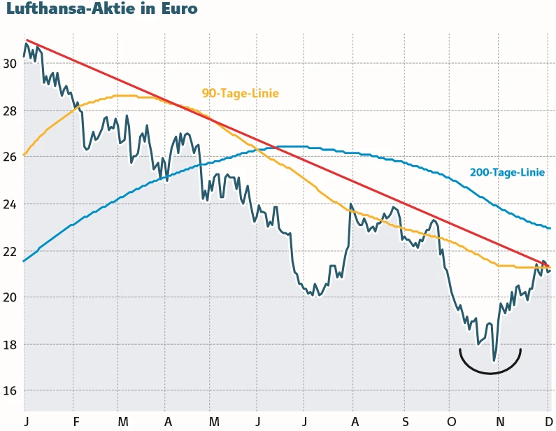 b) Zum anderen drückt das Chartbild (noch) etwas auf die Stimmung. Die Lufthansa-Aktie hat nach langem Sinkflug endlich den Boden gefunden. Allerdings ist der Titel noch nicht endgültig aus dem Abwärtstrend ausgebrochen. Heute ist es erneut die Abwärtstrendlinie im Bereich 21,20 Euro, die dem DAX-Wert zum Verhängnis wird. Die 90-Tage-Linie liegt ebenfalls auf diesem Niveau.