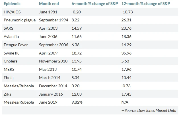 Von HIV bis CoronaNach Daten von Dow Jones Market Data (aufbereitet durch Marketwatch) performte der S&P500-Index in den 6 und 12 Monaten nach Ausbruch eines neuen Virus wie folgt (jeweils vom Monatsende des Ausbruchs aus berechnet):