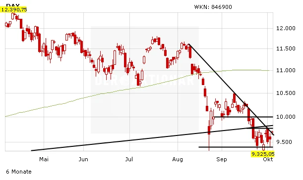 Nach unten kann der Bereich um 9.600 Zähler eine Stütze sein. Alarmstufe Gelb gilt, wenn die Marke von 9.396 Punkten durchbrochen wird. Die Ampel schlägt auf Rot um, sollte das August-Tief bei 9.338 Zählern unterschritten werden.