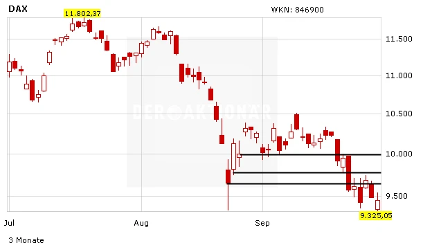 Am Dienstag war das wichtigste deutsche Börsenbarometer auf 9.325 Punkte und damit auf den tiefsten Stand seit vergangenen Dezember abgerutscht, konnte sich danach aber wieder etwas erholen. Für das heute endende dritte Quartal ist die Bilanz vor diesem Hintergrund verheerend: Mit einem Minus von aktuell fast 14 Prozent hat der DAX im abgelaufenen Vierteljahr so schlecht abgeschnitten wie seit vier Jahren nicht mehr.