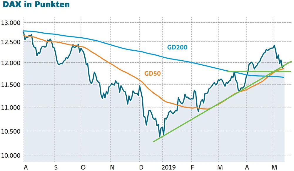 Der DAX musste ebenfalls Federn lassen, ist der 200-Tage-Linie aber nicht zu nahe gekommen. Der GD200 (11.660) befindet sich noch 2,3 Prozent unterhalb des aktuellen Kursniveaus. Als gute Unterstützung erwies sich der Bereich um 11.850 Zähler, wo neben der 50-Tage-Linie auch der kurzfristige Aufwärtstrend verläuft.