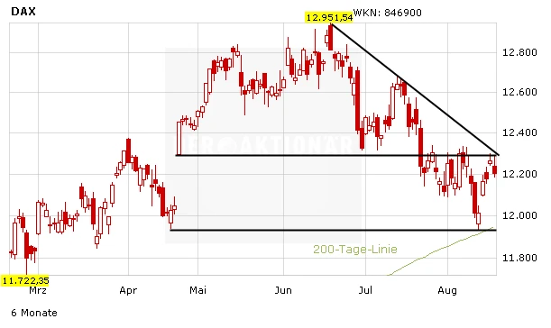 Der Euro hängt weiter in der Seitwärtsbewegung fest. Durch die neu aufflammenden geopolitischen Risiken könnte es nun zum erneuten Test der 200-Tage-Linie bei 11.947 Punkten kommen. Durch das Kursminus ist der Short mit der WKN DD0NJP wieder deutlich ins Plus geklettert. Anleger lassen die Gewinne nun laufen, beachten den Markt aber weiter genau.