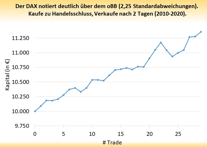 Ergebnis: Im Durchschnitt ist der DAX in den folgenden Tagen weiter gestiegen. Und das sogar recht stetig, wie ein Blick auf die Kapitalkurve unten zeigt (Haltedauer: 2 Tage). Das obere Bollinger Band konnte ihn also nicht stoppen, bzw. steigt das oBB in solchen Fällen typischerweise mit, sodass selbst kleinere Folgeanstiege im DAX dazu führen, dass der DAX zurück in seine Bänder findet.