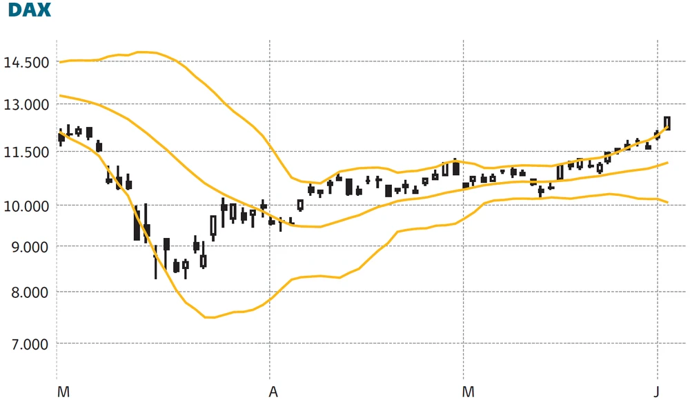 Der deutsche Leitindex erlebt derzeit eine der größten Siegesserien in seiner Geschichte. Kurzfristig scheint das Band jedoch mittlerweile erheblich überspannt. Ein bewährtes Instrument hierfür sind die nach John Bollinger benannten Bollinger Bänder. Sie zeigen an, in welchem Punkte-Bereich sich der DAX mit sehr hoher Wahrscheinlichkeit aufhält. Der gestrige Sprung hat den DAX allerdings deutlich über das obere Band (oBB) befördert. Eine technische Betrachtung.