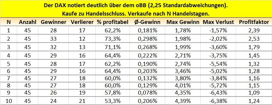 In der nachfolgenden Tabelle sind alle Fälle ausgewertet, da der DAX mehr als 2,25 Standardabweichungen von seinem 20-Tage-Durchschnitt abweicht (Zeitraum: 2010 - 2020).