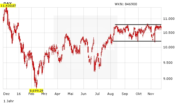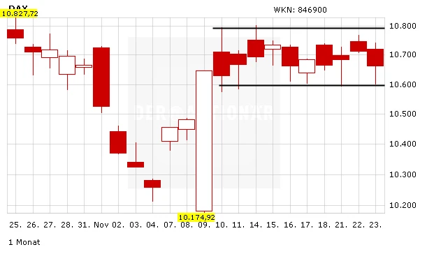Charttechnisch betrachtet bewegt sich der DAX immer noch in dem seit August gültigen Sägezahnmarkt, der bei 10.800 und 10.200 begrenzt wird. In den letzten Handelstagen hat sich ferner eine Unterstützung bei 10.600 Zählern ausgebildet. Ein Unterschreiten dieser Marke würde kurzfristiges Abwärtspotenzial bis 10.450 Punkte freisetzen, ehe die 10.200 in den Fokus rücken dürfte.