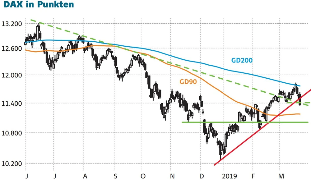 Der Sprung über die 200-Tage-Linie (aktuell bei 11.759) hat sich im Nachhinein betrachtet als Bullenflagge herauskristallisiert. Durch den Kurssturz am Freitag - bedingt durch wachsende Konjunktursorgen - wurden der seit Ende Dezember bestehende Aufwärtstrend sowie der seit Juni 2018 bestehende Abwärtstrend unterschritten. Selbst das markante Tief vom 8. März bei 11.405 in Verbindung mit der 38-Tage-Linie (11.400) konnte nicht verteidigt werden. Ferner hat der sogenannte Directional Movement Indikator ein Verkaufssignal generiert, sodass sich das technische Bild deutlich eingetrübt hat und weitere Verluste ins Kalkül gezogen werden müssen.