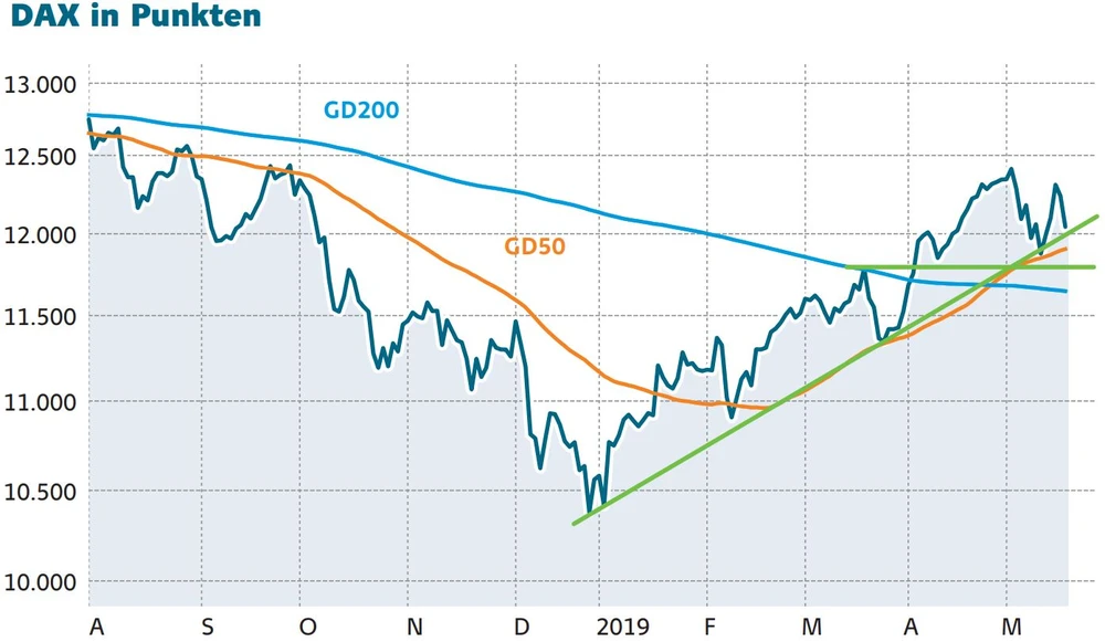 Der DAX verliert am Nachmittag 200 Punkte und notiert nur noch knapp oberhalb der 12.000-Punkte-Marke. In diesem Bereich verlaufen einige wichtige (horizontale) Unterstützungen sowie der kurzfristige Aufwärtstrend.