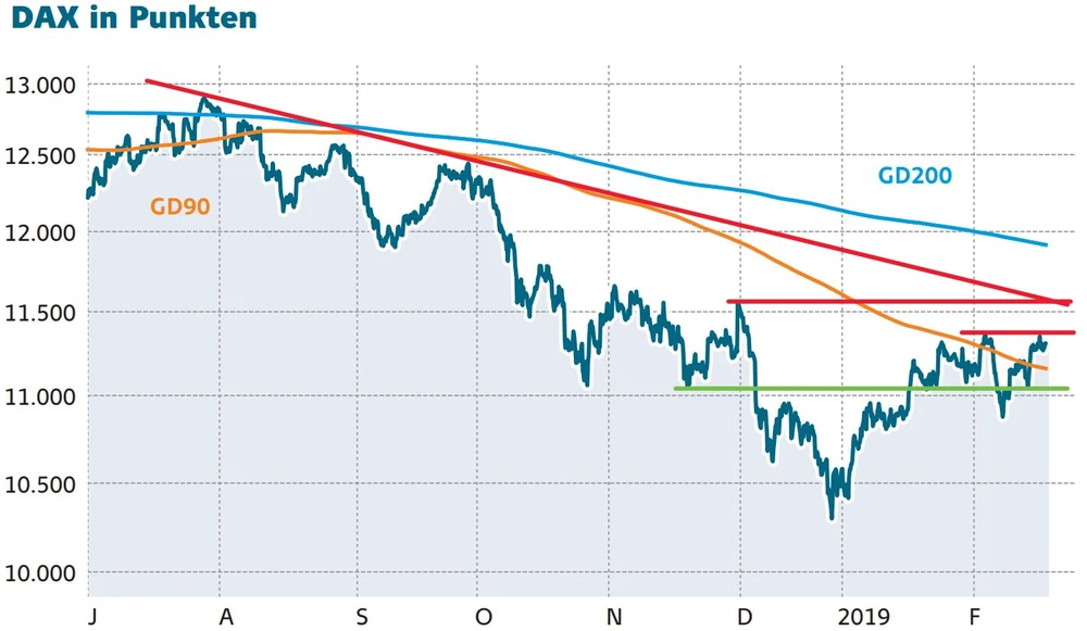 Aus charttechnischer Sicht bleibt der übergeordnete, seit Juni 2018 gültige Abwärtsmodus trotz der jüngsten Erholung von 11.018 auf 11.340 intakt. Dieser verläuft bei etwa 11.550 und bildet zusammen mit dem Dezember-Hoch den nächsten wichtigen Widerstand. Zuvor muss der DAX natürlich das Jahreshoch bei 11.372 herausnehmen.
