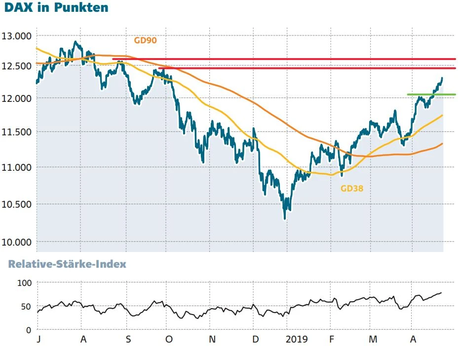 Aus technischer Sicht hat der DAX zunächst einmal noch Platz bis zu den Zwischenhochs von August und September 2018 bei 12.597 respektive 12.456 Punkten. Nach unten sichert das Ausbruchsniveau bei 12.029 Zählern ab.