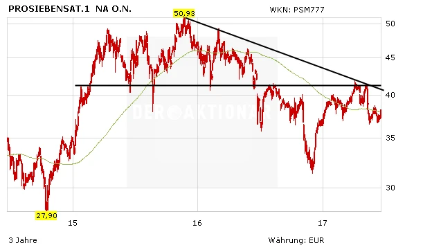 Richtig spannend wird aus charttechnischer Sicht allerdings erst oberhalb des Widerstands im Bereich der 40-Euro-Marke: Dort verläuft der langfristige Abwärtstrend, in dem sich die Aktie seit ihrem Hoch von Ende November 2015 befindet. Im Bereich von 41,60 Euro befindet sich zudem ein deutlicher Widerstand, an dem der Kurs in den vergangenen zwölf Monaten mehrmals gescheitert war. Erst oberhalb dieser beiden Marken würde sich das Chartbild wieder deutlich aufhellen.