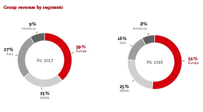 Zwar hat der Umsatz in allen Regionen zugelegt, besonders deutlich fällt das Wachstum jedoch in Amerika (plus 117 Prozent), Asien (plus 91 Prozent) sowie im Mittleren Osten und Nordafrika (MENA) (plus 86 Prozent) aus. In Europa lag das Umsatzplus bei 36 Prozent. Dadurch konnte der Einfluss in wichtigen Wachstumsmärkten – allem voran in Asien – weiter gesteigert werden, während die Abhängigkeit vom umkämpften europäischen Markt gesunken ist.