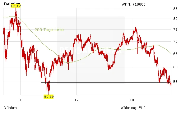Der Chart rät von einem Kauf der Daimler-Aktie ab. Die Unterstützung bei 54,50 Euro konnte nicht verteidigt werden. Damit ist ein weiteres Verkaufssignal im Markt. Das nächste droht zudem, sollte das Mehrjahrestief vom Juli 2016 bei 50,89 Euro unterschritten werden. Von einem Einstieg auf dem aktuellen Niveau ist angesichts der weiteren Abwärtsrisiken abzuraten.