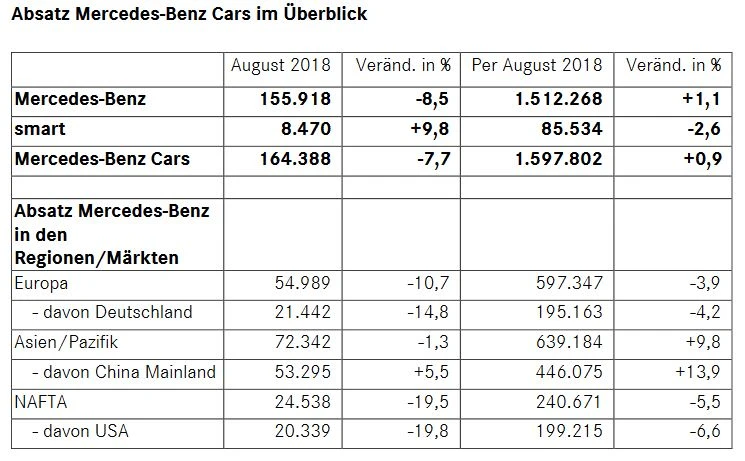Vor allem in Deutschland und in den USA ist der Verkauf deutlich gesunken. Auf dem Heimatmarkt hat Mercedes-Benz 21.442 Autos ausgeliefert (-14,8 Prozent). Auf der anderen Seite des Atlantik waren es 20.339 Fahrzeuge (-19,8 Prozent).