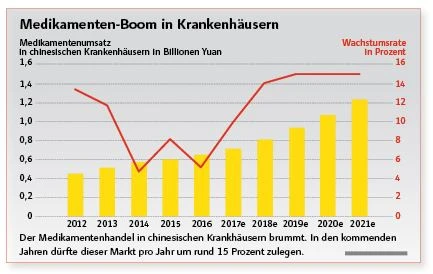 In den letzten Jahren ist China zum zweitgrößten Markt für Medikamente hinter den USA aufgestiegen. Laut dem Marktforschungsinstitut IQVIA wurden im Jahr 2017 schon 133 Milliarden Dollar umgesetzt, 2022 soll sich das Volumen auf satte 175 Milliarden Dollar erhöhen. Ein Faktor, der diese Entwicklung begünstigt, ist die stark alternde Bevölkerung in China. Aktuell zählt die Volksrepublik rund 1,4 Milliarden Menschen – mit einem stetig steigenden medizinischen Bedarf. Die Grafik demonstriert in diesem Zusammenhang das konstant hohe Wachstum von Medikamenten in chinesischen Krankenhäusern. Kein Wunder, dass die Regierung in China den Zugang zur (internationalen) Gesundheitsversorgung verbessern will.