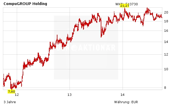 Der Vorstand von CompuGroup erwartet für das Geschäftsjahr 2014 einen Konzernumsatz von 519 Millionen Euro. Das Ergebnis vor Steuern, Zinsen und Abschreibungen (EBITDA) soll bei 100 bis 110 Millionen Euro liegen. Für das Jahr 2015 werden bereits Erlöse in Höhe von 542 Millionen Euro anvisiert. DER AKTIONÄR geht davon aus, dass CompuGroup die Umsatzschätzung für 2015 übertreffen wird. Der Grund: Der E-Health-Spezialist dürfte seine aggressive Akquisitionspolitik auch im nächsten Jahr weiter fortsetzen, was automatisch zu signifikanten Erlösausweitungen führen dürfte. Zudem sollte man sich vor Augen führen, dass das Management bei den Prognosen eher tiefstapelt, um diese dann sicher übertreffen zu können.