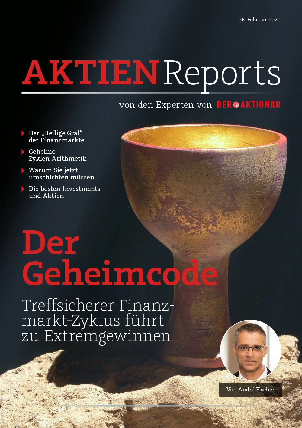 Auf den ersten zwölf Seiten des Aktienreports „Der Geheimcode“ weiht André Fischer den Leser in die Funktionsweise des Zyklensystems ein. Ab der Seite 13 wird dann kurz aufgezeigt, in welche Aktien man jetzt konkret umschichten sollte. Dabei verrät Fischer, welche Anlageklasse der „Heilige Gral“ der Finanzmärkte als zukünftigen Outperformer-Markt identifiziert hat.