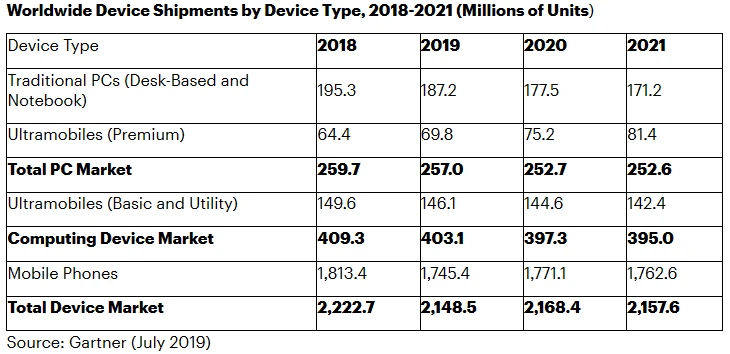 Der PC-Markt wuchs zwar im zweiten Quartal 2019 – doch auch auf dem PC-Markt sind die langfristigen Aussichten weniger rosig. Laut Gartner soll sich die Anzahl der PC-Verkäufe bis 2021 deutlich reduzieren. Nur bei den Ultramobiles beziehungsweise Ultrabooks soll sich der Markt auf 81 Millionen Geräte bis 2021 verbessern.